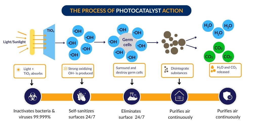 This ingenious surface coating isn’t just a regular coating; it’s a superhero against bacteria, viruses, fungi, VOCs, and odors. It uses photocatalyst action (using the energy of visible light) to break down such invisible threats continuously. Picture a forcefield, invisible yet powerful, ensuring your safety and comfort at every turn.